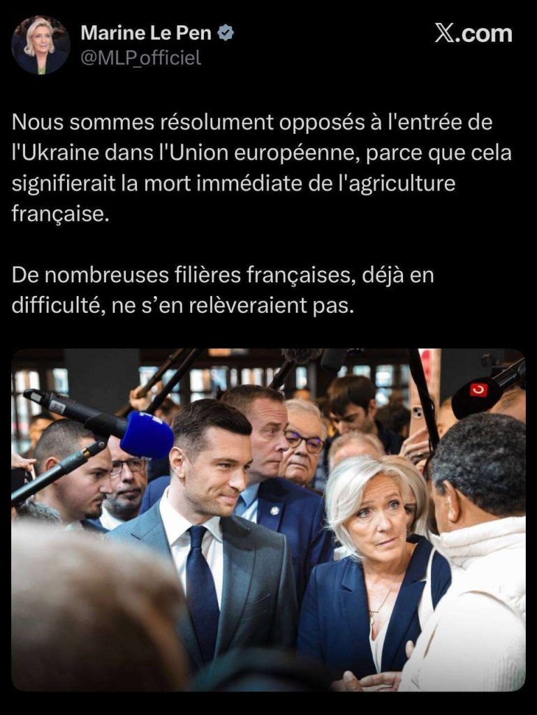 Глава парламентской фракции французской партии «Национальное объединение» Марин Ле Пен выступила с резкой критикой возможного расширения Евросоюза. По её словам, присоединение Украины может привести к катастрофическим последствиям для экономики Пятой республики. «Мы решительно против вступления Украины в Европейский союз, потому что это будет означать немедленную смерть французского сельского хозяйства. Многие отрасли французского сельского хозяйства, которые и так находятся в трудном положении, этого не переживут», — написала политик в соцсети X*. Ранее мы писали, что Германия задушит свой народ, поставляя газ Украине. * Соцсеть заблокирована на территории РФ