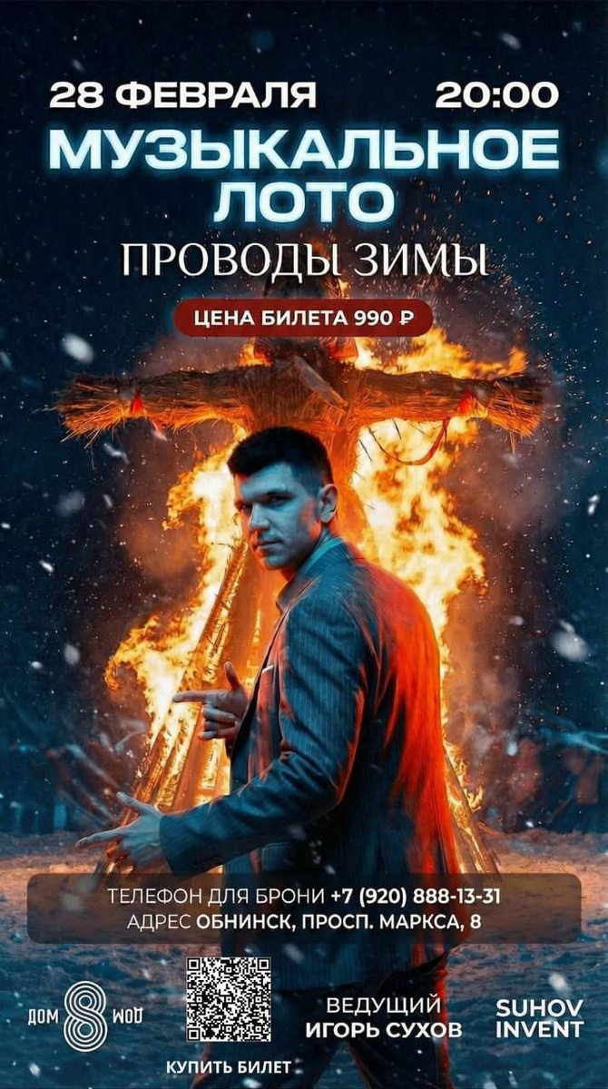 в ресторане «Дом 8» 🗓 28 февраля | суббота Весело провожаем зиму и встречаем весну под музыку, смех и атмосферу настоящего праздника! Последний день зимы – отличный повод собраться с друзьями и зарядиться отличным настроением ⚡️ Слушай любимые хиты, отмечай их в бланках, участвуй в конкурсах и первым кричи: «Бинго!» В ПРОГРАММЕ: ❄️ ведущий стендап-комик с искромётным юмором ❄️ музыкальные раунды и весёлые конкурсы ❄️ популярные хиты всех времён ❄️ розыгрыш подарков ❄️ уютная атмосфера и вкусная кухня ресторана «Дом 8» Берите друзей, вторые половинки или приходите всей компанией – проводим зиму шумно и весело! 🎟 ПРИОБРЕСТИ БИЛЕТЫ 🕗 Начало в 20:00 🗓️ Дата: 28 февраля 📍 Ресторан «Дом 8» г. Обнинск, пр-т Маркса 8, этаж 2 📞 Бронь столов: +7 (920) 888-13-31 Все обновления, акции и новинки в наших соц.сетях: Telegram ВК 👍 Подписаться | Ваша реклама