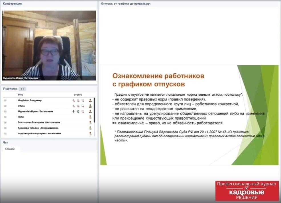 "! 1. График отпусков по форме № Т-7 или по произвольной форме? 2. Обязательно ли выяснять и учитывать пожелания работников по времени предоставления отпуска? 3. Нужно ли знакомить работников с графиком отпусков? 4. Включать ли в график отпусков задолженности за прошлые годы и новых работников? 5. Когда и какими способами можно извещать работников о дате начала отпуска? 6. Как осуществить перенос отпуска на другой срок из-за больничного в различных случаях? 7. Кто имеет льготы по времени предоставления отпуска? 8. Как правильно разделить отпуск на части? 9. Когда выдавать работнику окончательный расчет и трудовую книжку при отпуске с последующим увольнением (мнение КС РФ)? 10. Как Конституционный Суд разрешил вопрос о выплате компенсации за неиспользованный отпуск? Получить бесплатный вебинар