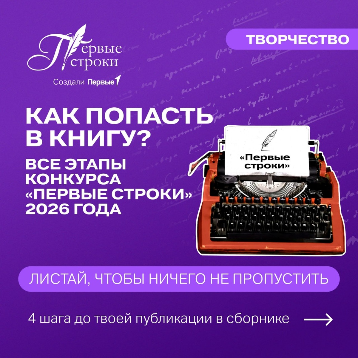 »! Открываешь, а там твоё произведение для конкурса творческих работ Движения Первых и множество воспоминаний. Как ты придумывал свою вселенную, учился работать в любимом жанре вместе с экспертами, шлифовал стиль, мастерство... и стал одним из самых молодых авторов страны! Хочешь, чтобы мечта о писательской карьере сбылась? Читай карточки — в них рассказываем, как пройти путь от идеи до первой публикации. Регистрируйся — vk.cc/cUpI3H 🎭 Движение Первых. Творчество #ПервыеСтроки
