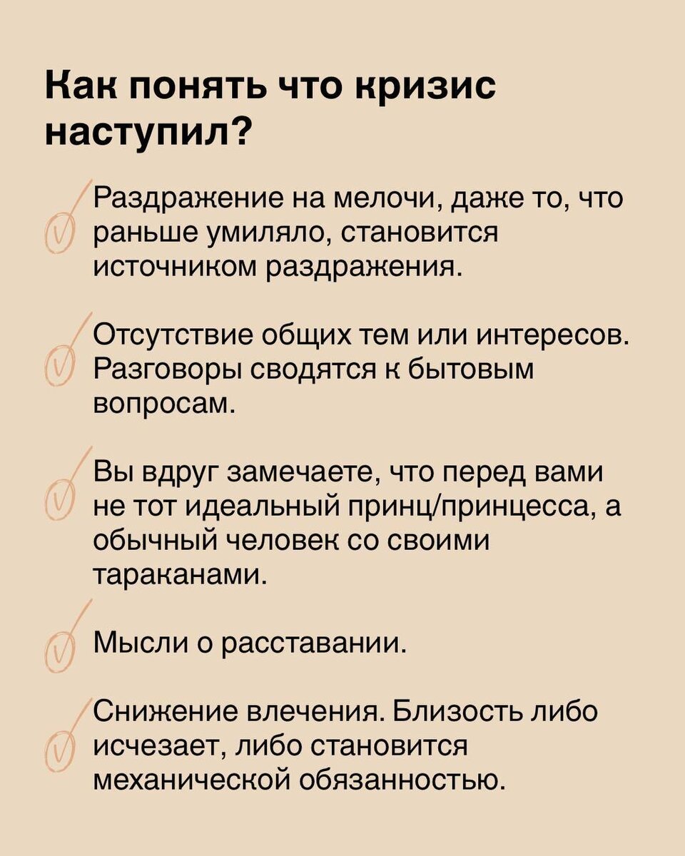 Миф или реальная опасность? 🤩 Это естественный этап развития любых близких отношений. Он не всегда означает, что вы разлюбили и пора разводиться. Скорее это признак того, что ваши отношения переходят на новый уровень – из иллюзий в реальность. Если этот кризис пройти, вы станете ближе. Как понять, что кризис наступил? 🦾 Листайте карусель. К сожалению пары приходят к нам, когда уже наломана куча дров… На самом деле обращаться к семейному психологу желательно в самом начале любого кризиса, тогда будет легче с ним справиться. А мы поможем! 🙂 Анна Григорьева