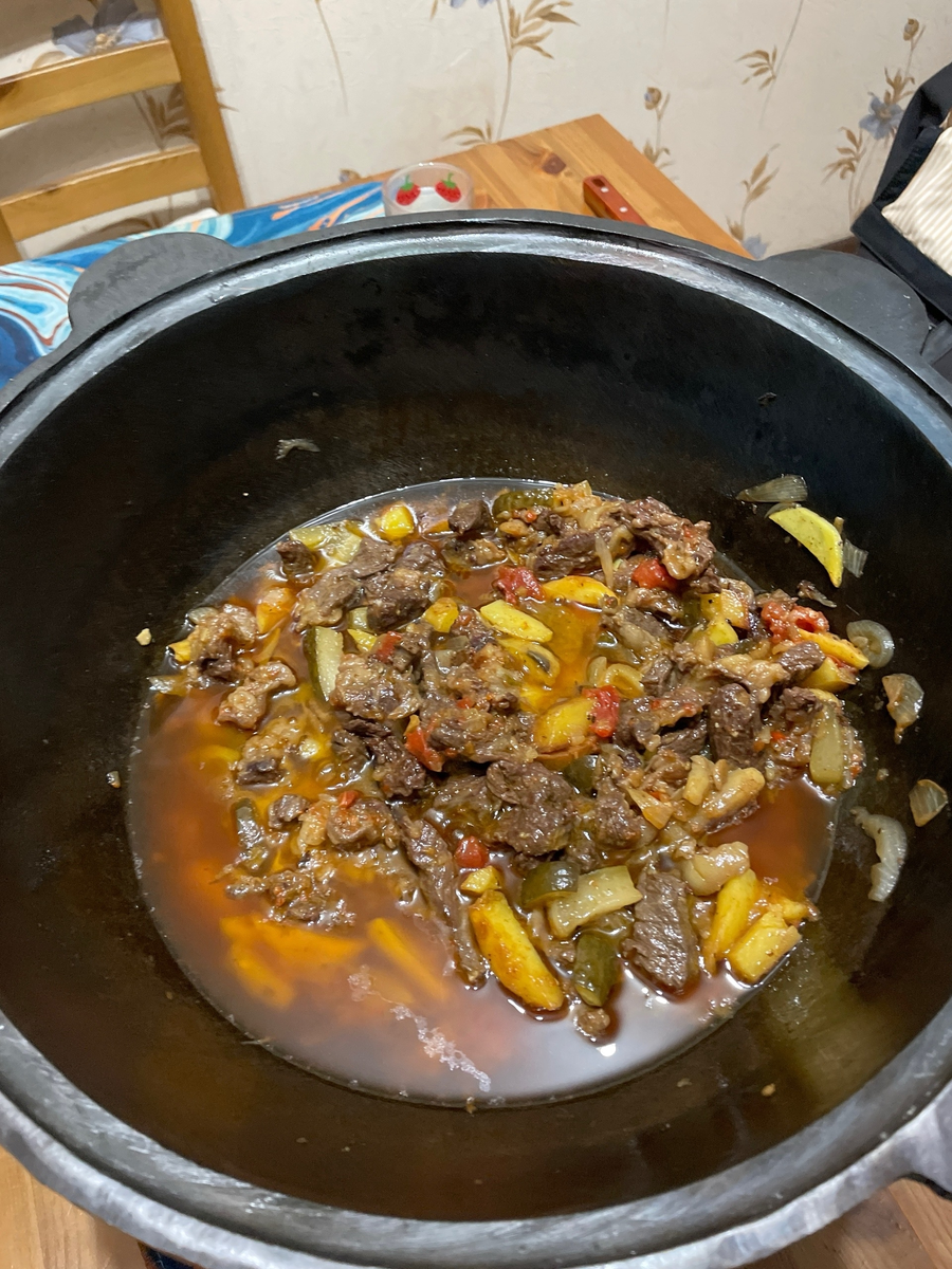 Итак, азу по-татарски. Азу я предпочитаю готовить в казане, поэтому потребуется казан с плоским донышком или толстостенная кастрюля. Второй элемент правильного азу — это топленое масло, достать его сейчас легко. Граммовки: