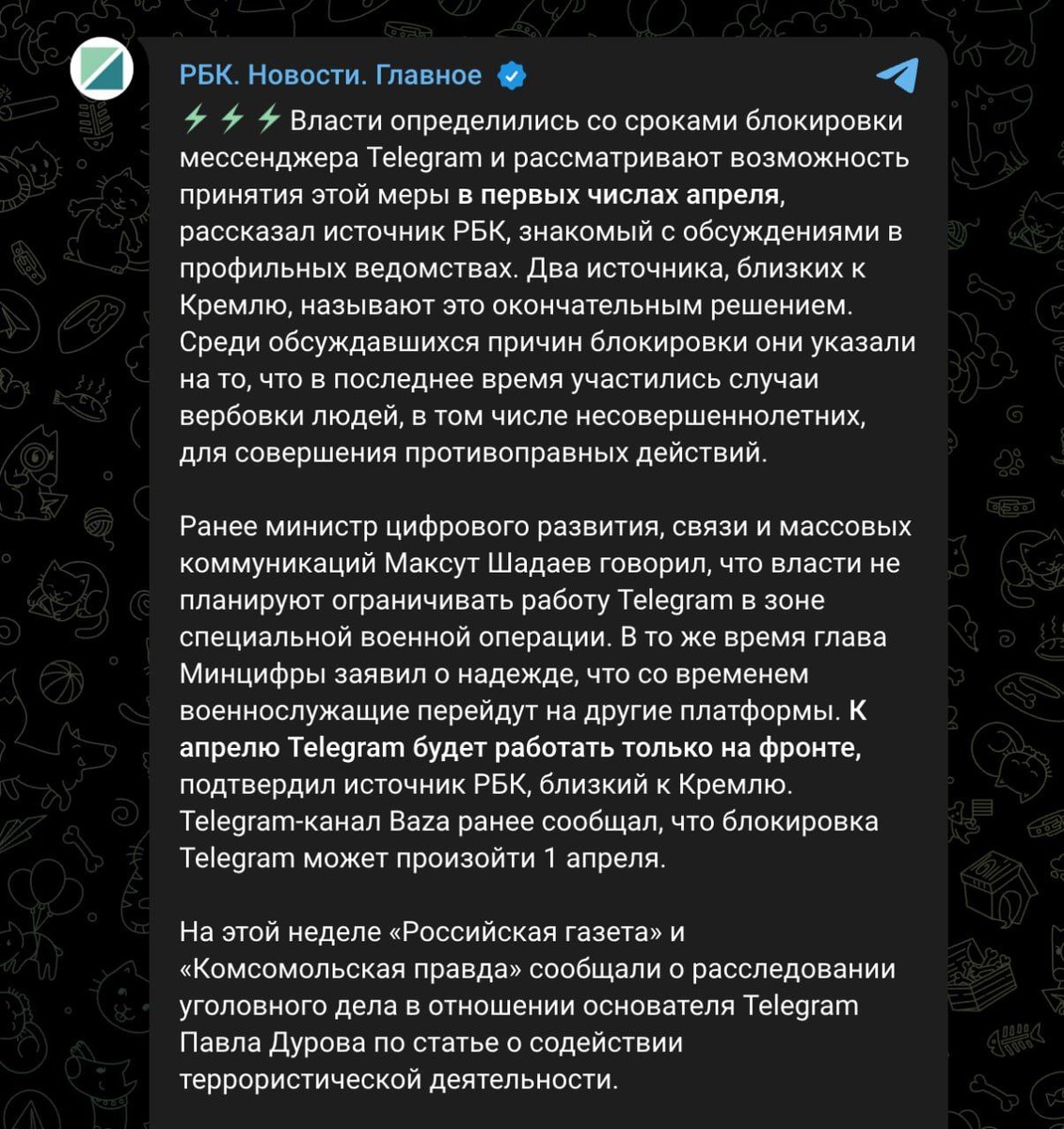 Телеграм будет заблокирован в первых числах апреля — пишет РБК: ссылаясь на источник из профильного ведомства