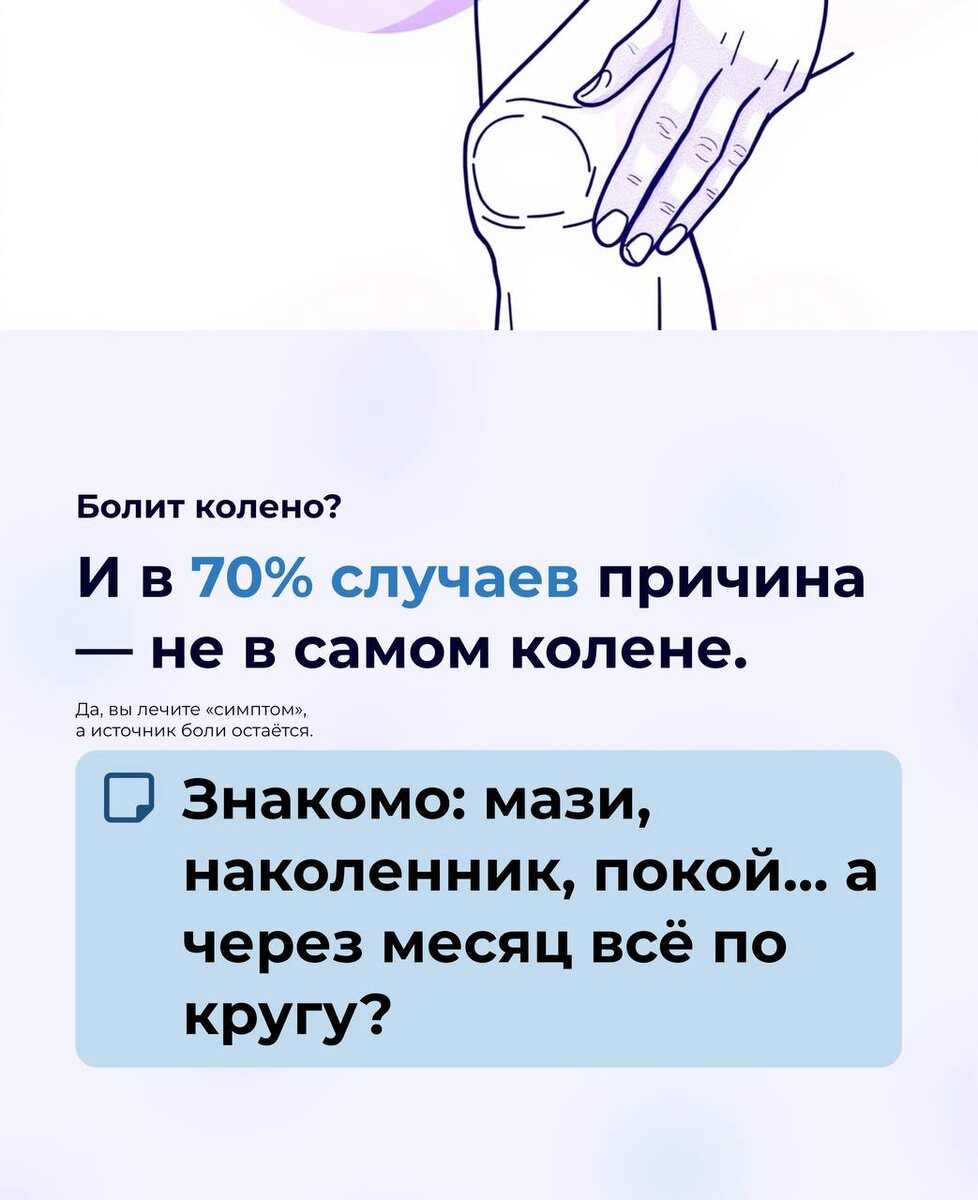 стопе. И пока лечится только симптом — боль возвращается. Что обычно делает человек? 🔹 Мажет обезболивающим 🔹 Носит наколенник 🔹 Ограничивает движение 🔹 Терпит Почему это не решает проблему? Потому что воспаление — это следствие. А причина остаётся — и продолжает перегружать сустав. В «ЗдравКлиник» мы подходим к боли в колене системно: ✔ проводим диагностику причины ✔ оцениваем мышечный баланс и ось нагрузки ✔ снимаем воспаление при необходимости ✔ восстанавливаем правильную механику движения Наша цель — не просто убрать боль, а вернуть вам свободу движения без страха и ограничений. Если колено болит при ходьбе, после спорта или к вечеру появляется отёк — это повод не терпеть, а разобраться.