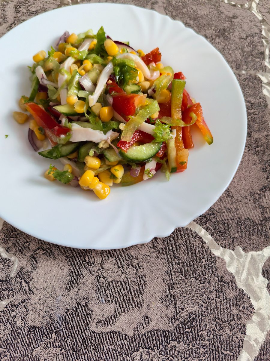 1 кальмар отварной и очищенный и нарезанный соломкой ( у меня готовый в масле, слила масло).