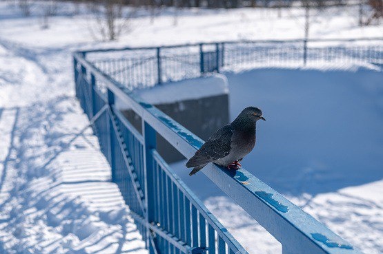 A pigeon sits on the railing of a winter bridge, its feathers fluffed against the biting cold. Below, the river flows steadily, its surface glistening with patches of ice that reflect the pale winter sun. The air is crisp, and the world feels hushed, as if nature is holding its breath.