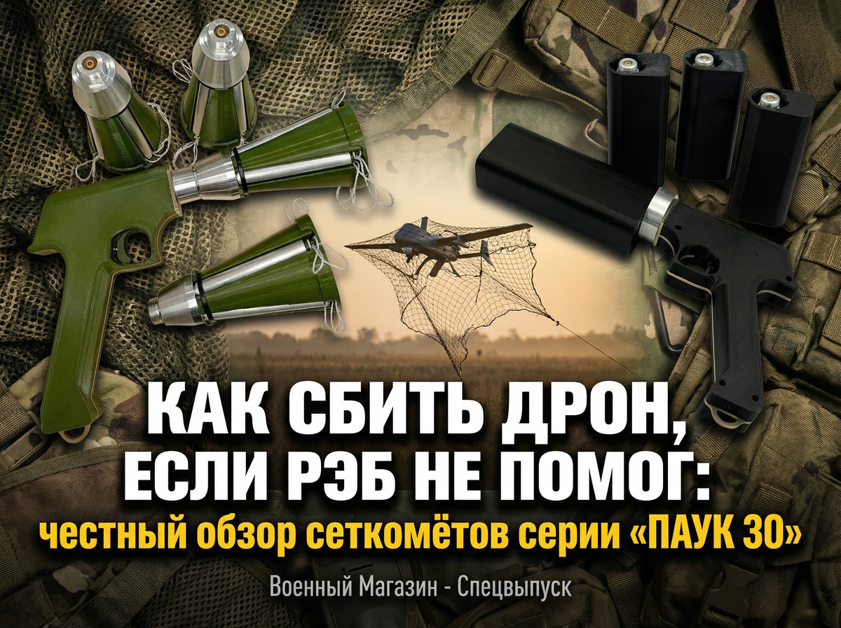 Ситуация, знакомая многим: вы сидите в укрытии, РЭБ (станция радиоэлектронной борьбы) работает на полную мощность, но над вами всё равно зависает вражеский коптер со сбросом. Противник просто сменил частоту управления, и ваш «купол» его не видит. Стрелять по маленькой маневрирующей точке из автомата — лотерея с минимальными шансами на успех. Именно для таких дистанций (до 25–30 метров) создано оружие последнего шанса — ручные пехотные сеткомёты. Они не пытаются заглушить сигнал. Они физически накидывают на винты дрона кевларовую сеть. Разбираем одну из самых удачных отечественных разработок в этом классе — сеткомёт пистолетного типа «ПАУК 30» и его обновленную быструю версию «30Б». Концепция устройства строится на интуитивной простоте: навел, нажал спуск, захватил цель. Никаких сложных настроек. При нажатии на электронный спуск выстреливается сеть размером 2,5 на 2,5 метра (общая площадь 6–7 квадратных метров). Скорость вылета снаряда — от 20 до 30 метров в секунду. Этого достаточно, ч
