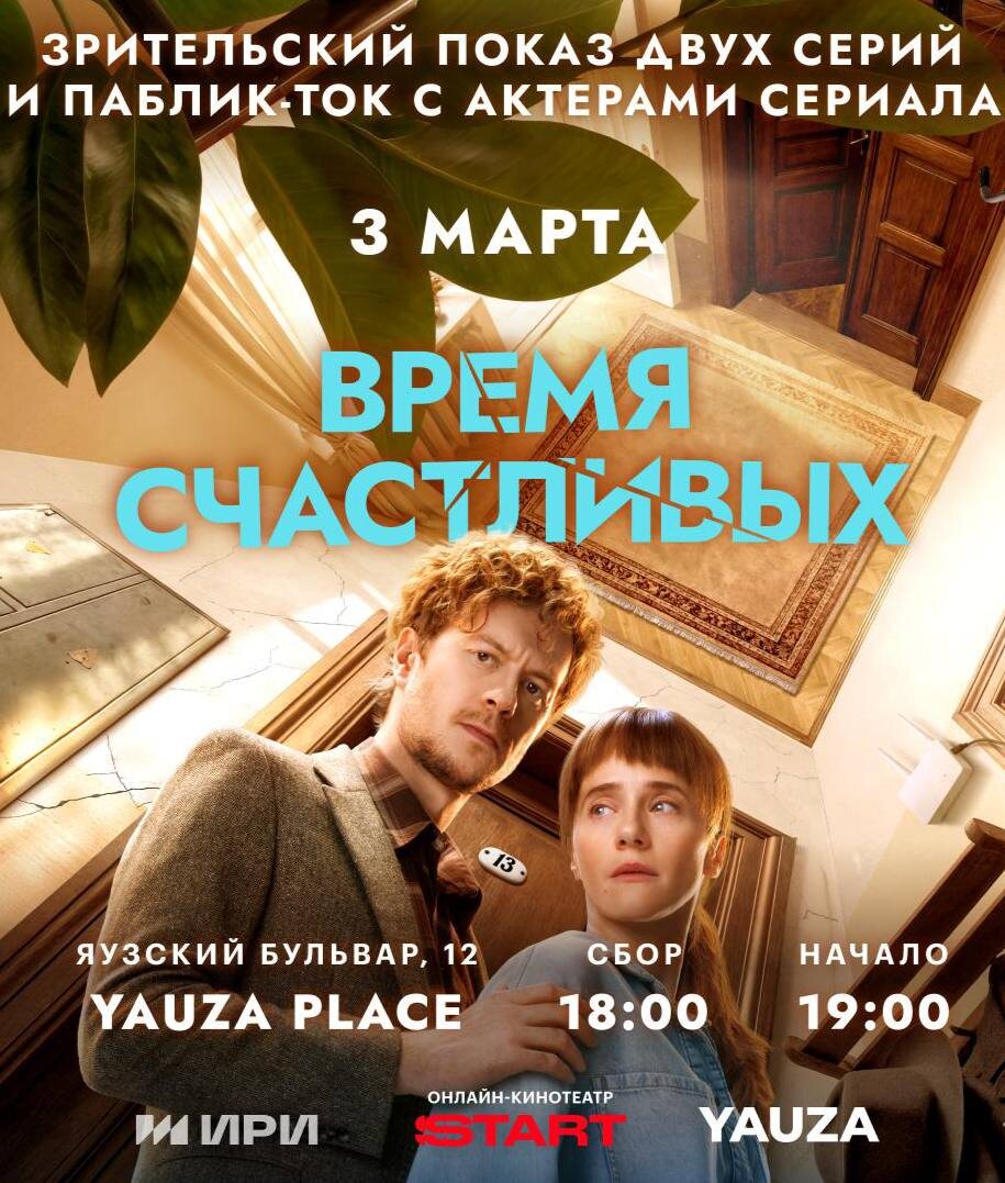 3 марта онлайн-кинотеатр START организует в атмосферном особняке Yauza place зрительский показ двух первых серий драмы «Время счастливых» за несколько дней до официальной премьеры! По сюжету, незадолго до развала СССР у Марины и Ивана Счастливых рождается тройня и начинается жизнь в отдельной — наконец-то своей! — квартире номер 13. Но наивные 80-е сменяются голодными 90-ми, и настроения в семье уже не назовешь радужными. А потом приходит 2012 год, и энергия нового времени. Как начать новую жизнь, построить карьеру и, самое главное, вновь понять и принять родных, когда каждый сделал столько ошибок? Программа – просто восторг: 🍂паблик-ток с актерами: Ольгой Лерман, Вадимом Сосниным и Софьей Аржаных 🍂обсуждение по мотивам сериала с Юлией Федотовой – психологом с 13-летним стажем 🍂welcome drink – коктейль «Время Счастливых», разработанный Yauza Place специально для гостей кинопоказа Приятно, что такое атмосферное место, как Yauza place, в последнее время всё чаще становится центром