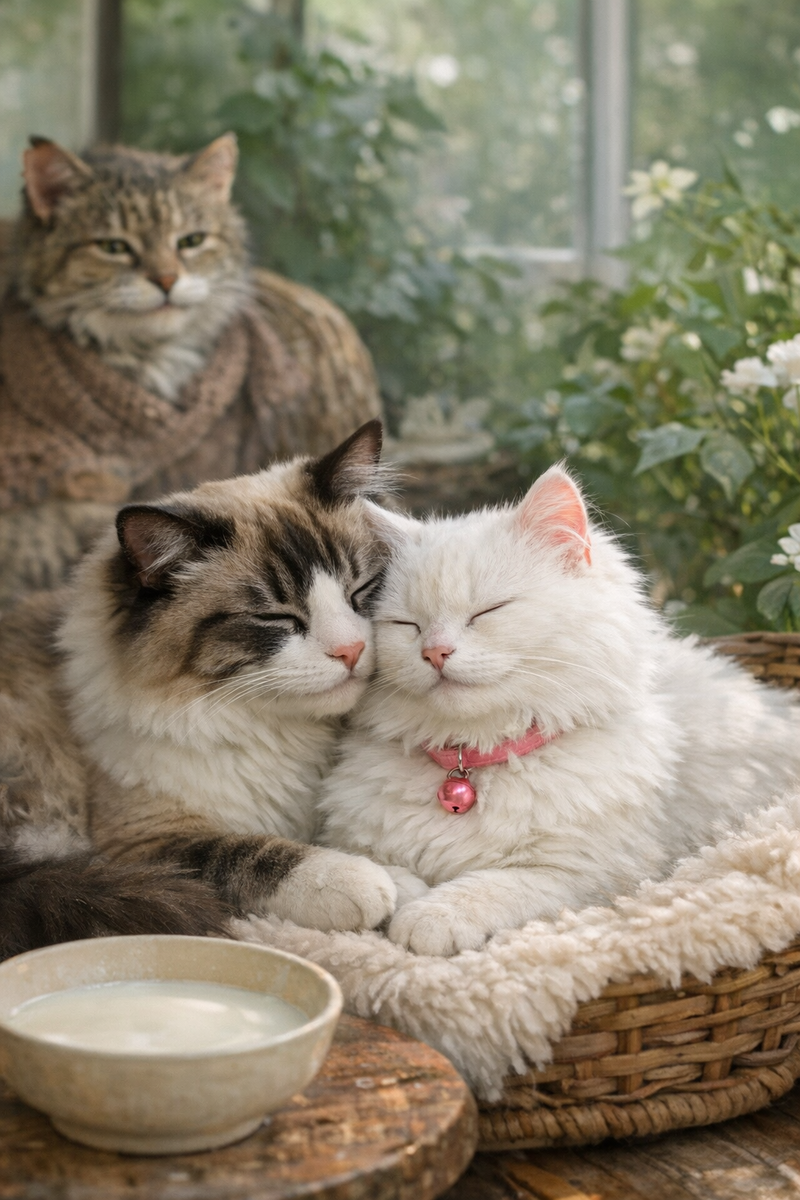 Она взяла Снежинку на руки (та сразу замурчала) и понесла домой. Барсик, увидев её, подбежал, обнюхал и... узнал запах! Хоть шерсть была серой, пахло от неё той самой ночью, мятой и счастьем. Он лизнул её в нос.