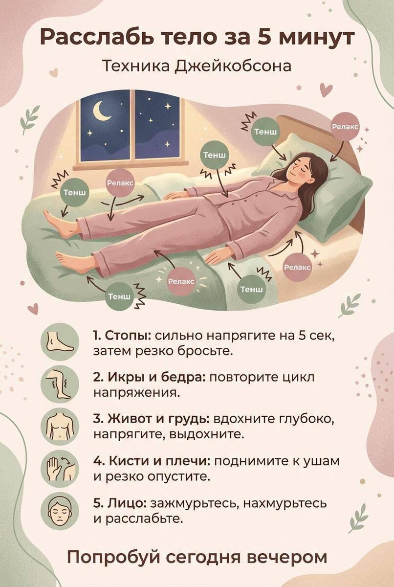 Продолжаю тему сна. Если вчера мы говорили о том, почему сон жизненно важен после 35, то сегодня — о том, как помочь себе реально расслабиться, а не просто лечь и «пытаться уснуть». Потому что лечь в кровать — не равно расслабиться. Тело лежит, глаза закрыты, а внутри — планёрка, диалог из 2017 года и тревожный сериал собственного производства. И вот здесь нам очень помогает техника прогрессивной мышечной релаксации по Эдмунд Джейкобсон. Суть простая: через напряжение → к глубокому расслаблению. Когда мы сознательно напрягаем мышцы и резко отпускаем, нервная система получает сигнал: «Опасности нет. Можно выдыхать». Это особенно важно, если: — вы засыпаете, но часто просыпаетесь; — тело будто «деревянное» к вечеру; — мысли крутятся по кругу; — тревожность усиливается именно ночью. Сегодня я прикрепляю к посту простую пошаговую схему. Попробуйте выполнить её прямо перед сном — это займёт буквально 5 минут. Важно: ✔ напрягаем на 5 секунд; ✔ отпускаем резко; ✔ замечаем разницу между «