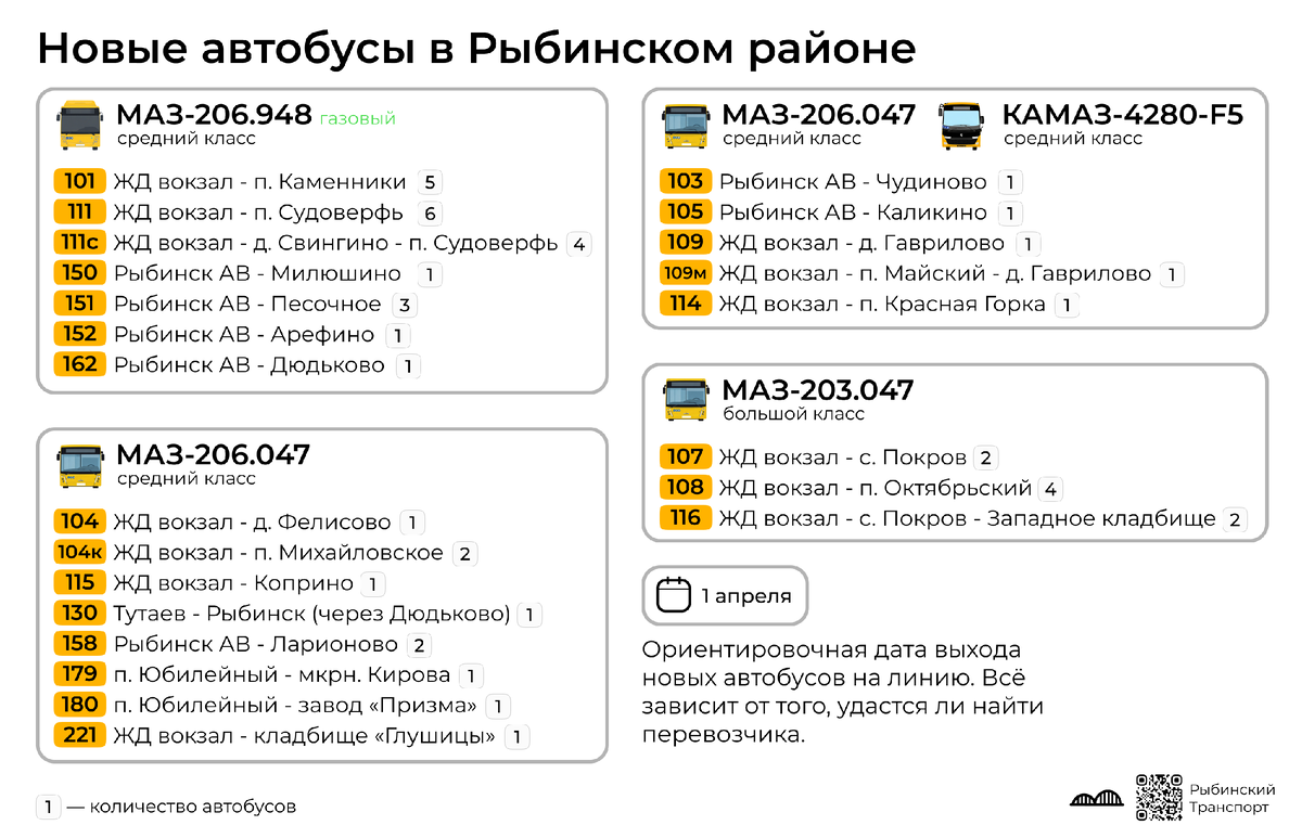 Мы уже не в первый раз затрагиваем эту тему. В этом посте мы уточним, сколько и каких автобусов будут работать на определённых маршрутах в нашем районе. С начала апреля на пригородные, межмуниципальные и междугородние маршруты планируется вывести новый транспорт. Ожидается, что он будет функционировать до 31 марта 2023 года. 101 ЖД вокзал — п. Каменники • 🟦 СК • 5 ед. • МАЗ-206.948 103 Рыбинск АВ — Чудиново • 🟦 СК • 1 ед. • МАЗ-206.047 / КАМАЗ-4280-F5 104 ЖД вокзал — д. Фелисово • 🟦 СК • 0 ед. • МАЗ-206.047 ¹ 104к ЖД вокзал — п. Михайловское • 🟦 СК • 2 ед. • МАЗ-206.047 105 Рыбинск АВ — Каликино • 🟦 СК • 1 ед. • МАЗ-206.047 / КАМАЗ-4280-F5 107 ЖД вокзал — с. Покров • 🟨 БК • 2 ед. • МАЗ-203.047 108 ЖД вокзал — п. Октябрьский • 🟨 БК • 4 ед. • МАЗ-203.047 109 ЖД вокзал — д. Гаврилово • 🟦 СК • 1 ед. • МАЗ-206.047 / КАМАЗ-4280-F5 109м ЖД вокзал — п. Майский — д. Гаврилово • 🟦 СК • 0 ед. ² 111 ЖД вокзал — п. Судоверфь • 🟦 СК • 6 ед. • МАЗ-206.948 111с ЖД вокзал — д. Свингино — п.