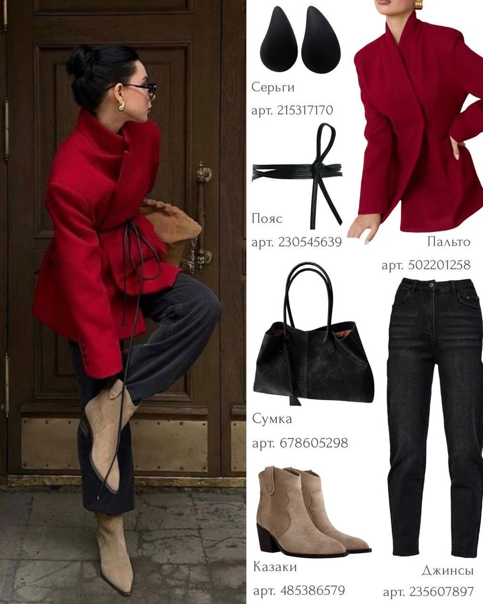 Красное структурное пальто — главный герой образа. Оно мгновенно притягивает внимание и формирует уверенный, сильный силуэт. В сочетании с черными джинсами образ приобретает сдержанную основу, позволяя верхней одежде звучать максимально эффектно.
