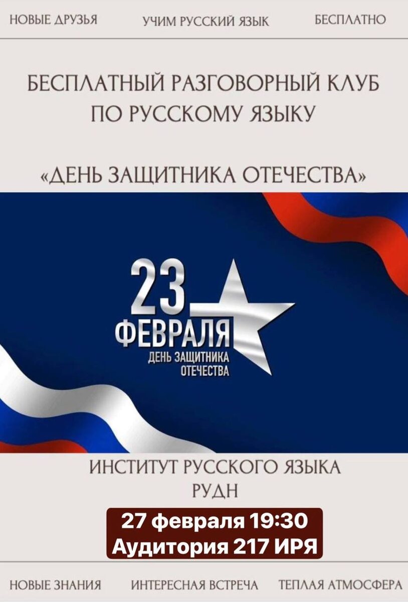! ☺️ Мы рады пригласить вас на очередной разговорный клуб, который состоится в стенах Института русского языка РУДН. В этот раз темой нашего обсуждения станет «День защитника Отечества». 📆 27 февраля 2026 🕐 с 19:30 до 20:00 📌 Институт русского языка РУДН, аудитория 217 ❔Что вас ждет? «День защитника Отечества» — это важный праздник в России, который отмечается ежегодно 23 февраля. Этот день посвящен чествованию всех, кто служит или служил в Вооруженных силах, а также защитников в более широком смысле. До скорой встречи! 🤝 #РазговорныйКлубРУДН #КРЯ5РУДН