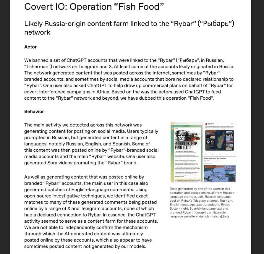 !⚡️ Забанили кучу китайских аккаунтов за троллинг и генерацию контента против японского премьера. Ну, ок. И заодно, как бы между делом, решили "почистить" пользователей, которые помогали Рыбарю – исправляли ошибки в текстах и переводили их на английский. И тут самое интересное! В их же "расследовании" признают, что не могут подтвердить, что эти тексты вообще были сгенерированы их моделью! 🤦♂️ То есть, по ключевым словам решили "поработать" на тему "российского вмешательства". Видать, эта тема уже настолько никому не интересна, что кроме доклада OpenAI об этом нигде и не упоминают. А мораль проста: будущее за собственными LLM! Пока мы зависим от западных разработок, даже нормально поработать спокойно не можем. Был бы у нас ресурс, подали бы в суд на Альтмана за дискриминацию и ущербный нейминг их операции – "Fish Food". Chat GPT, видимо, и название подсказывало. 😂 И заодно, вот вам картинка, которая отлично иллюстрирует всю ситуацию. Какие-то корявые переводы, подозрения… В обще