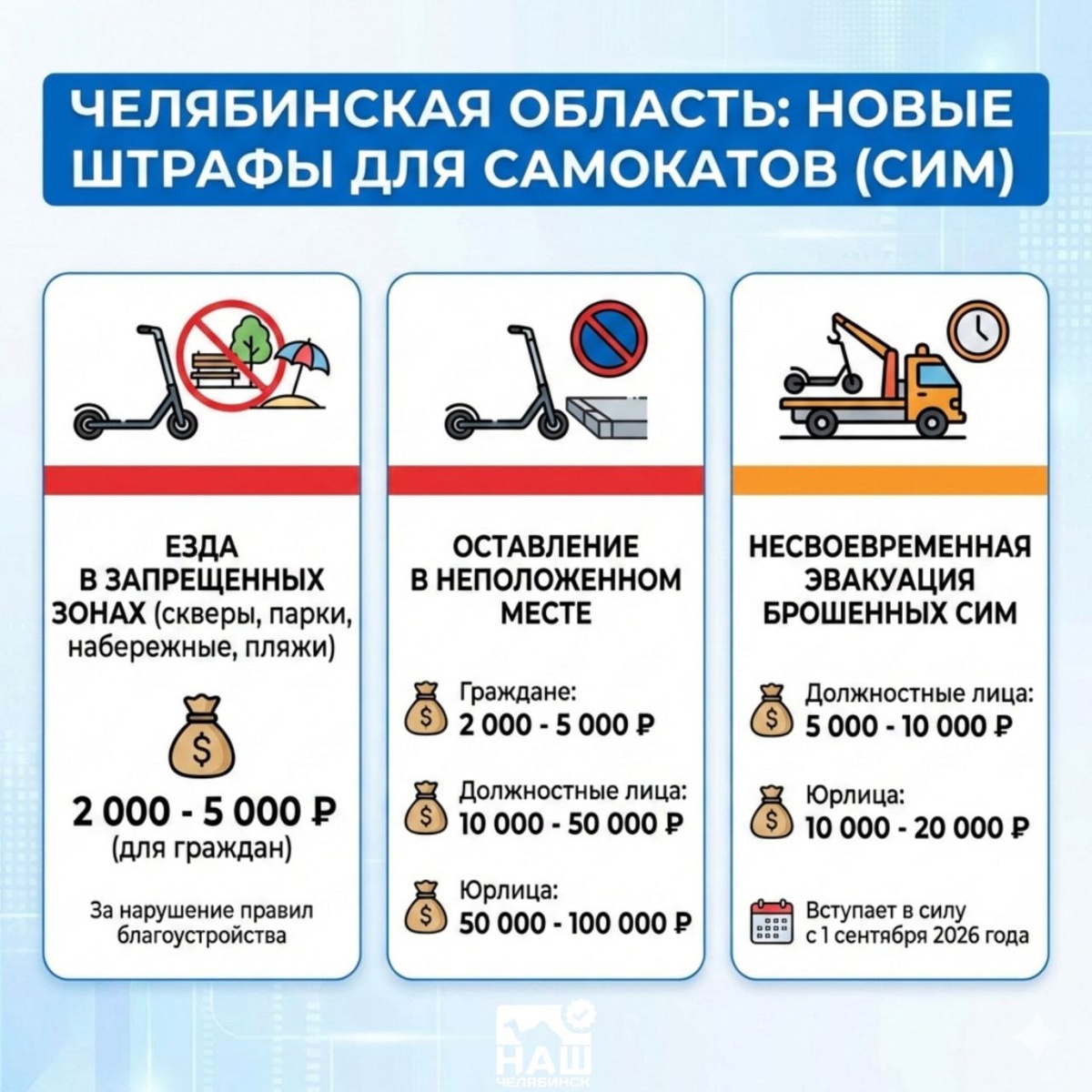 Так, за езду на самокате по скверам, паркам, набережным и пляжам штраф составит от 2 до 5 тысяч рублей. Более подробно – на картинке. Новые правила вступят в силу 1 сентября 2026 года.