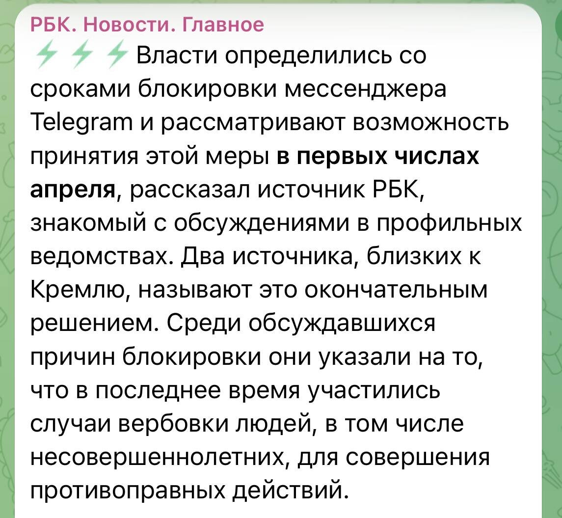 Уже в первых числах апреля: власти определились со сроками блокировки мессенджера - СМИ Блокировка мессенджера планируется на всей территории РФ в начале апреля. Как сообщает РБК, с ссылкой на источники, близкие к Кремлю, это уже окончательное решение Среди обсуждавшихся причин блокировки: частые случаи вербовки людей, в том числе несовершеннолетних. К апрелю Telegram будет работать только на фронте