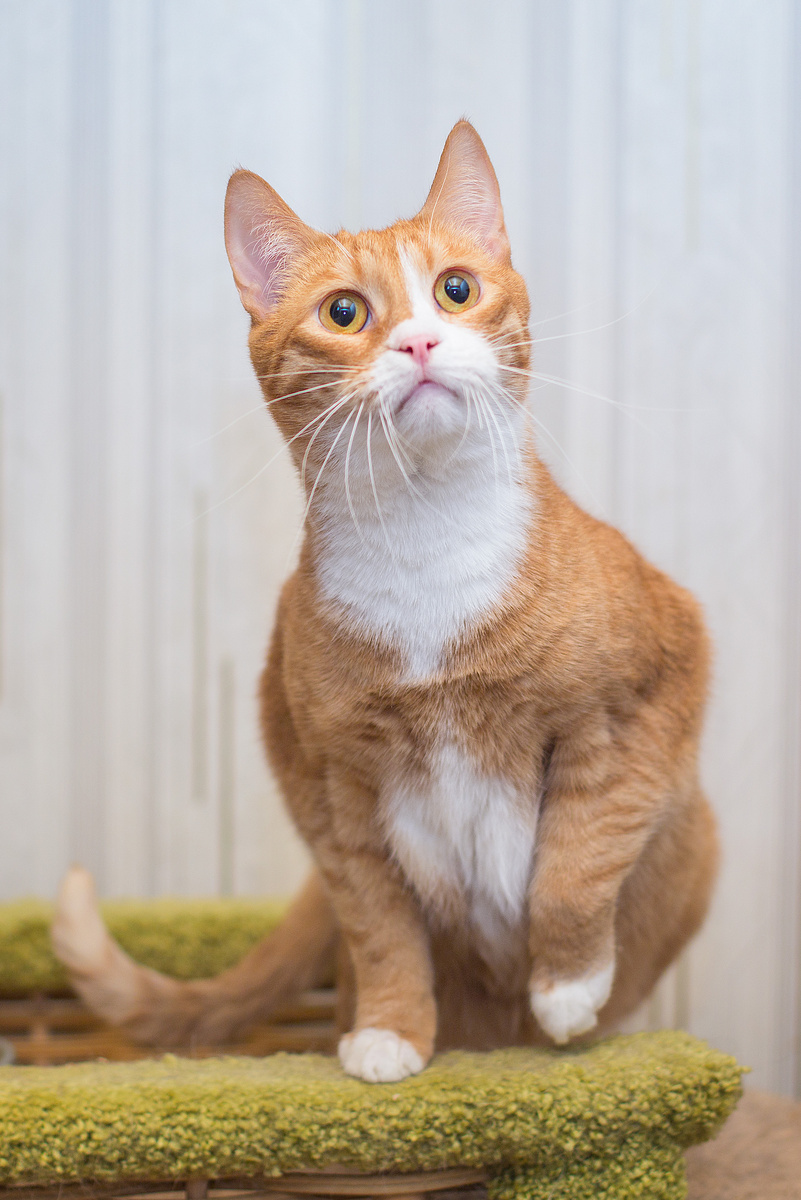 Портос. Это не кот, это огненный вихрь в белых носочках! Рыжий, как персик на рассвете, толстенький, будто взял золото на чемпионате по поеданию паштета. Его миссия – исследовать мир с энтузиазмом маленького урагана. Мячик? Пойман! Игрушечная мышка? ! Покорена. Он встречает каждого гостя громким "МУРРР!", звучайшее как: "Привет! Мое имя Портос! У меня энергии на троих, и я готов делиться!". Он будет тереться об ноги, словно самый обаятельный дипломат, и смотреть глазами- янтариками, полными безграничного, чуть наивного доверия. Он верит, что каждый человек – его потенциальный друг и конечно, источник вкусняшек. Его сердце большое и жаждет любви без остатка.