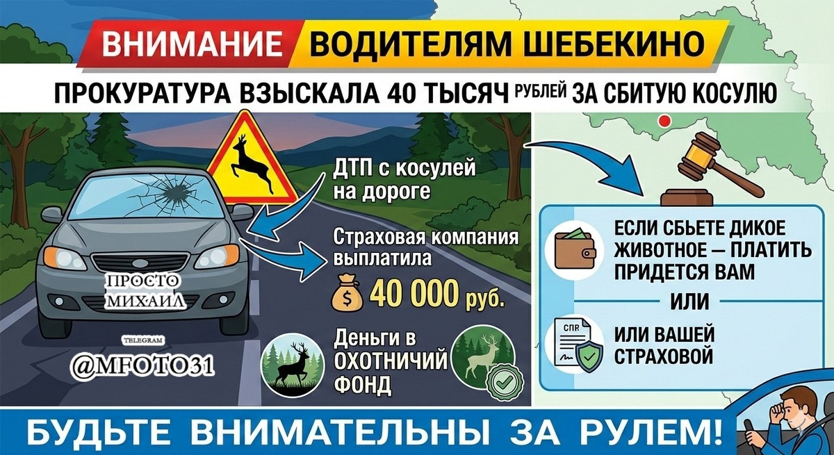 Прокуратура взыскала со страховой компании 40 тысяч рублей за сбитую на наших дорогах косулю. Деньги уйдут в охотничий фонд. Если собьете дикое животное — платить придется либо вам, либо страховой. Будьте внимательны за рулем вШбк 🇷🇺 Шебекино | Наша группа ВК