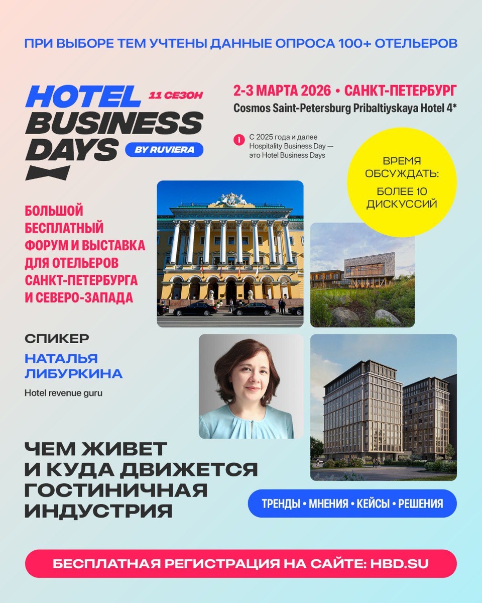 😀 Сейчас плотно готовимся к встречам, тренингам и офлайн-активностям с вами. Скоро вернёмся с регулярными материалами, идей накопилось много. В начале весны отельеры, эксперты и поставщики встречаются на Hotel Business Days, чтобы обсудить и разобрать, чем сегодня живёт и куда движется гостиничная индустрия в России. А в текущей ситуации — много важных тем для обсуждения. Это большой форум и выставка ведущих поставщиков и партнеров отрасли. Собирается широкое отельное сообщество — качественно, полезно и бесплатно для отельеров. Приглашаю присоединиться! Я участвую как спикер в Санкт-Петербурге. На форуме 12 тематических сессий, 4 зала и больше 80 спикеров. Программа разработана для всех ключевых позиций в отеле — от отдела продаж до хаускипинга. Есть несколько секций для руководителей и блок по гостиничному девелопменту. Когда и где: 2–3 марта, Санкт-Петербург https://hbd.su/saint-petersburg 26–27 марта, Москва https://hbd.su/moscow Увидимся в Санкт-Петербурге!