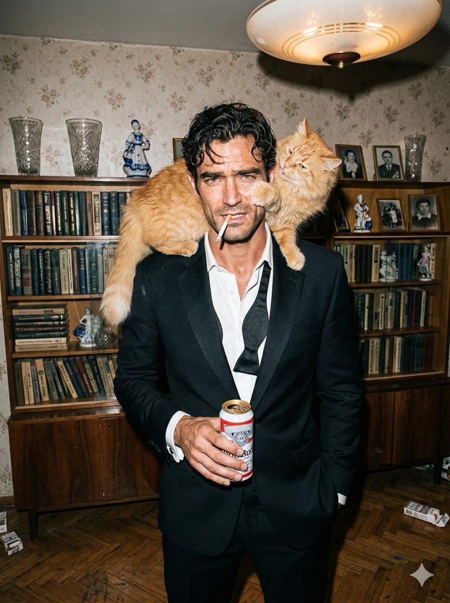 Еще больше мужских промтов https://prompt1.ru/naznachenie/dlja-fotosessii-muzhchiny/ Мужчина с референса в классическом чёрном смокинге с развязанной бабочкой и расстёгнутым воротом белой рубашки стоит в непринуждённой позе с сигаретой в зубах и банкой пива Bud в руке. На его плече и спине расположился рыжий кот, лапой тянущийся через лицо хозяина. Атмосфера хаотичной вечеринки после официального мероприятия. Обстановка — обычная советская квартира. На заднем плане — деревянный книжный стеллаж из СССР с полками, заставленными старыми книгами, хрустальными вазами, фарфоровыми статуэтками и фотографиями в рамках. Обои с мелким цветочным узором, потёртый паркет на полу, тусклый свет люстры-«тарелки» на потолке. Снимок в стиле Терри Ричардсона — резкая вспышка в лоб, жёсткий прямой свет, лёгкая зернистость плёнки, откровенная репортажная эстетика, эффект «застали врасплох». Формат 3:4. Делаю в gptunnel (промокод на скидку 75% PROMPT1_75 ) или телеграм боте LookKit AI(2 генерации в Nano