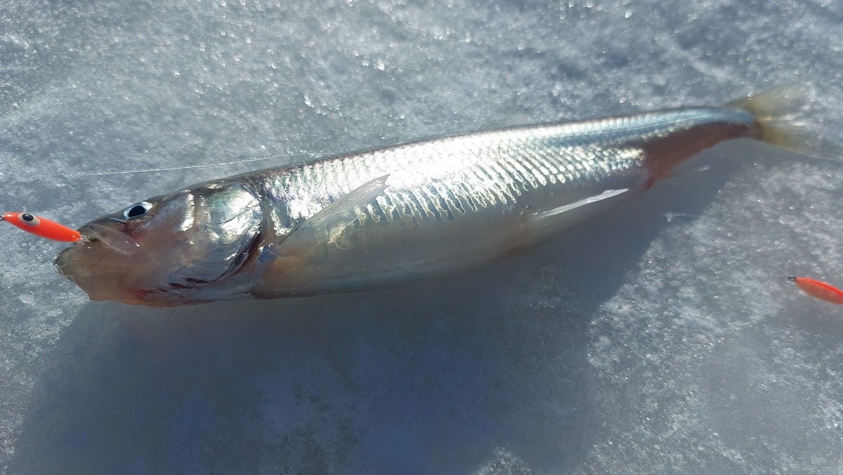 Прошло буквально семь минут, и я реализовал первую поклёвку. Вытащив с глубины крупную корюшину, первую достойную за одиннадцать рыбалок. Рыба клюнула уверенно, плавно придавив кивок. До одиннадцати часов было поймано мной восемь хвостов корюшки. Четыре крупных, четыре средних. Мелочи не было. Рыба клевала редко, но метко.