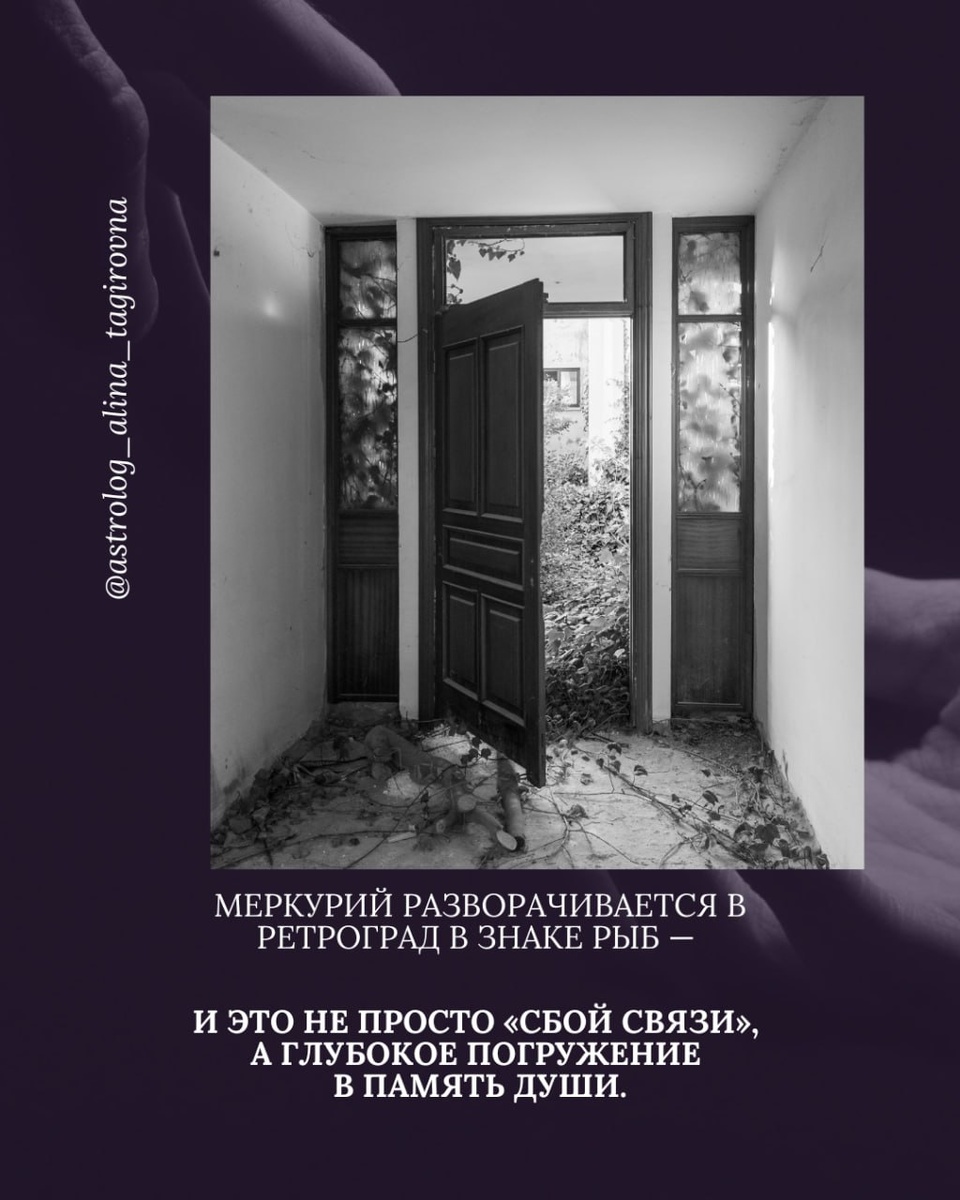 пройдёт этот же путь. Именно поэтому мы имеем дело не с моментом, а с большим смысловым коридором, который проживается трижды. Это транзит возврата, вспоминания, пересмотра и переписывания внутренних сценариев. Ретро-петля Меркурия в Рыбах: почему это важно 🔢🔢 февраля – 🔢🔢 февраля — первый проход (прямое движение) Вы уже что-то почувствовали: мысли, сомнения, разговоры, идеи, решения, желания, обещания. Но тогда многое казалось туманным, не до конца оформленным. 🔢🔢 февраля – 🔢🔢 марта — ретроград, возврат туда, где было: ➡️не договорено; ➡️не осознано; ➡️не прочувствовано; ➡️не названо своими именами. 🔢🔢 марта – 🔢 апреля — финальный проход, там, где появляется ясность, зрелость и решение. Если сейчас в жизни «всплывают» старые темы — это не случайно. Это и есть работа ретро-петли. Меркурий в Рыбах: язык души, а не логики Рыбы — знак: ➡️бессознательного; ➡️памяти рода; ➡️интуиции; ➡️чувств; ➡️тонких состояний; ➡️иллюзий и самообмана. Меркурий здесь думает не словами,