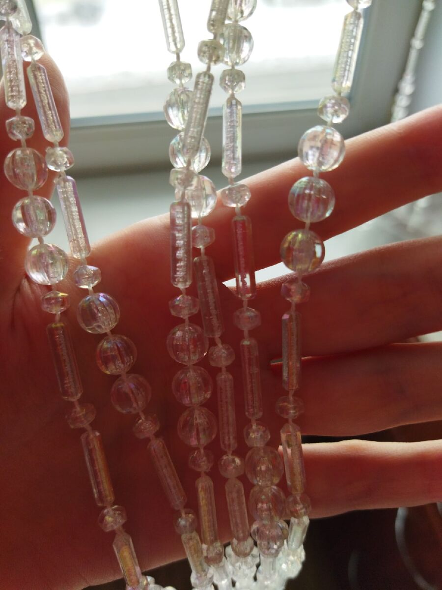 Добро пожаловать в гости на мой канал! Давно я хотела себе занавески из бусин. Однако стеклянные стоят дорого и к тому же тяжёлые. Я нашла интересную и недорогую альтернативу. Подобрала пластиковую мишуру. Взяла принципиально прозрачные бусины, чтобы не выгорали и на моё счастье они ещё переливаются. Ничего не могу с собой поделать, у меня часто "включается сорока". Выбрала необходимую длину. В моём случае мне нужны были короткие, чтобы не задевали меня в процессе уборки и при этом не лежали на полу. Ещё их как вариант можно поверх основной занавески развесить. Исходя из этого плана пришлось длинные нити "половинить". На одном из концов этих нитей я сделала петли из нити в тон (как вариант можно леску) и петлями зацепила за крючки на карнизе в том порядке, котором нужно. Каждая нить свободно двигается и я могу выровнять так как мне необходимо. Занавеска готова! Спасибо, что нашли время прочитать мою статью!