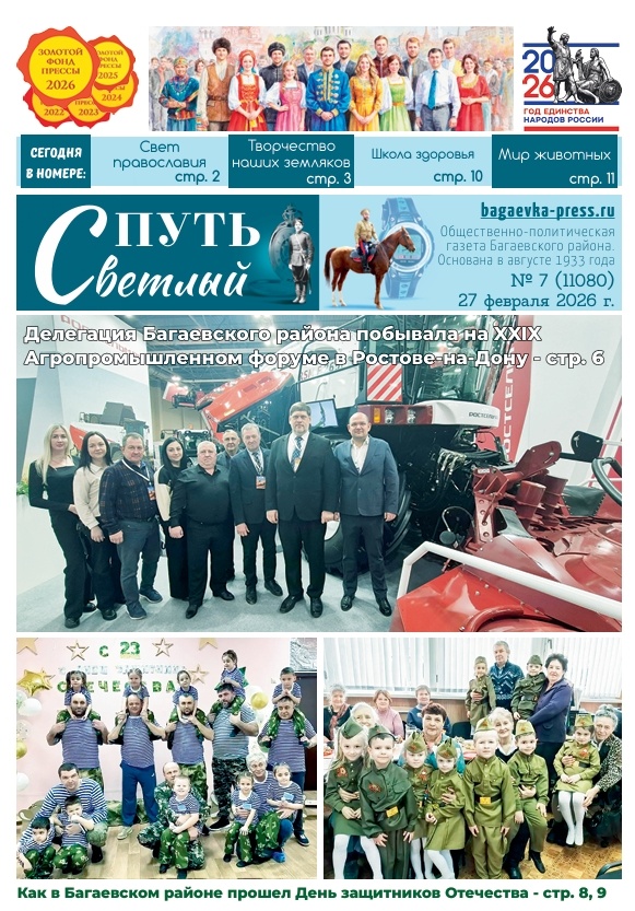 Урок о Масленице и Великом посте прошёл в Багаевской школе №2 — стр. 2 Творчество наших земляков. «Мы справимся! Победа будет за нами» — багаевский школьник Денис Гусаков обратился с проникновенным письмом к своему прадеду-фронтовику — стр. 3 В РДК состоялся праздничный концерт «Стена России!» — стр. 5 Сотрудники ЦСО провели акцию «Согрей теплом солдата» ко Дню защитника Отечества — стр. 5 Администрация Багаевского сельского поселения отчиталась о работе перед жителями хутора Белянин и поселка Дачный — стр. 5 Багаевский район принял участие в XXIX агропромышленном форуме в Ростове-на-Дону — стр. 6 Муниципальный этап Спартакиады Дона-2026: результаты соревнований по волейболу — стр. 6 В Багаевском районе наградили победителей конкурса «Учитель года Дона–2026» — стр. 7 Участник СВО провел патриотический урок для молодежи — стр. 8 Багаевские школьники изучили принципы поискового движения на патриотическом слете — стр. 8 Дети и родители из детского сада «Радуга» соревновались в военно-спо