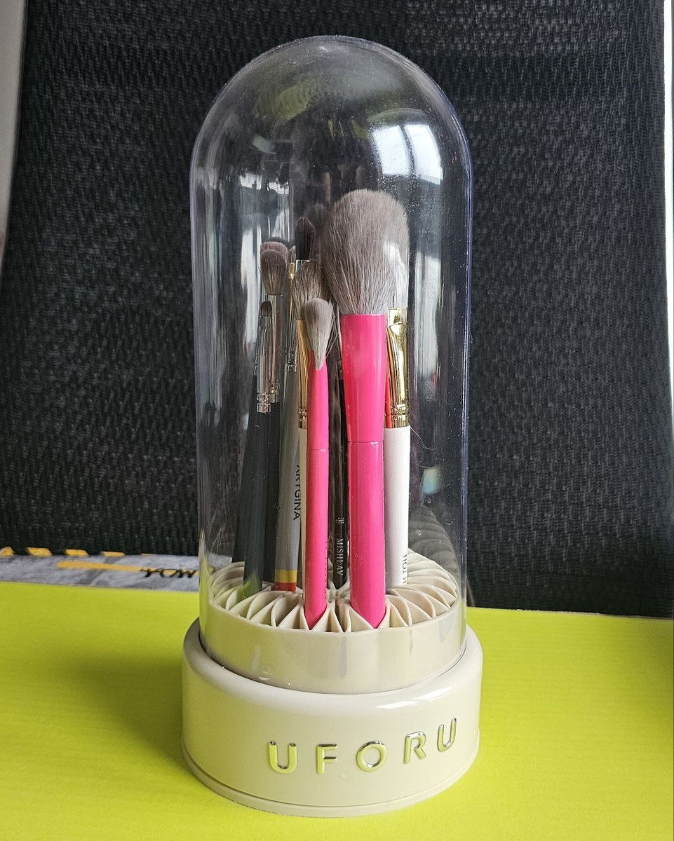 Я долго мучилась: помыла кисти, поставила сушиться, ворс мнётся, и потом растушёвка уже «не та». И вот, нашла три спасения Первое: органайзер 3в1 Это одновременно подставка, штука для мытья и сушилка. Размер компактный: даже на маленьком столике помещается. Закрытая крышка защищает от пыли, и гигиена остается в норме. А на дне эта пупырчатая штука, об которую я и мою кисточки Второе: вращающийся прозрачный органайзер Это уже чисто для хранения. Повернул, и нужная кисть уже в руке. Не нужно перебирать весь хаос Третье: дорожный тубус Вмещает максимум 5 кистей, но зато они в полной безопасности: ворс не гнётся, ничего не пачкается и ничего не ломается Неожиданные помощники: защитные сеточки на ворс. Я их никогда не выбрасываю. Даже если нет тубуса, надеваю сеточку и спокойно кидаю кисть в косметичку Правильное хранение действительно продлевает жизнь кистям в разы. А хорошие кисти сейчас стоят как половина люксовой косметики
