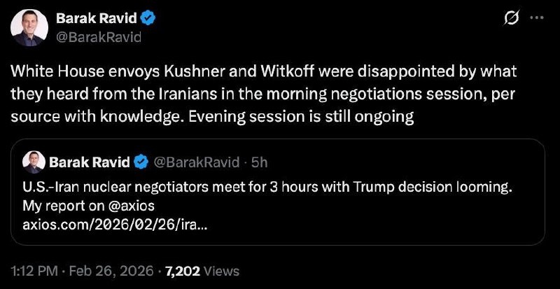 Делегации Ирана и США достигли серьезного прогресса в Женеве и начали обсуждать элементы будущего соглашения, заявил глава иранского МИД. По его словам, технические группы стран начнут консультации в Вене со 2 марта. ✔️ Иран отклонил все требования США на переговорах в Женеве. Об этом сообщила The Wall Street Journal со ссылкой на неназванные государственные СМИ исламской республики и анонимные источники. ✔️ Спецпосланники Трампа Уиткофф и Кушнер разочарованы утренним раундом переговоров между США и Ираном по атому, сообщает журналист Axios Барак Равид. 👆👆👆 Ждём 🤔наблюдаем 🧐 #АНАЛИЗ_ВСЕГО #РЫНКА #КАЖДЫЙ_ДЕНЬ #АКЦИИ #КРИПТА #ВАЛЮТЫ #КУРС #РУБЛЯ #ЮАНЬ_РУБЛЬ #ДОЛЛАР_РУБЛЬ 👇👇👇 ТЕЛЕГРАМ КАНАЛ https://dzen.ru/id/61356a6d5e488b5f67683584