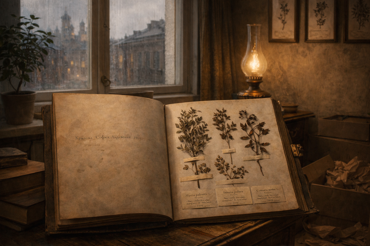 Листы плотной бумаги, потемневшие по краям, с высушенными растениями, закреплёнными пожелтевшими полосками бумаги. Под каждым образцом — надпись мелким аккуратным почерком. Латинское название. Место сбора. Дата. Почерк — с лёгким наклоном, с характерным удлинённым «р» — Варя бы узнала его среди тысячи других.