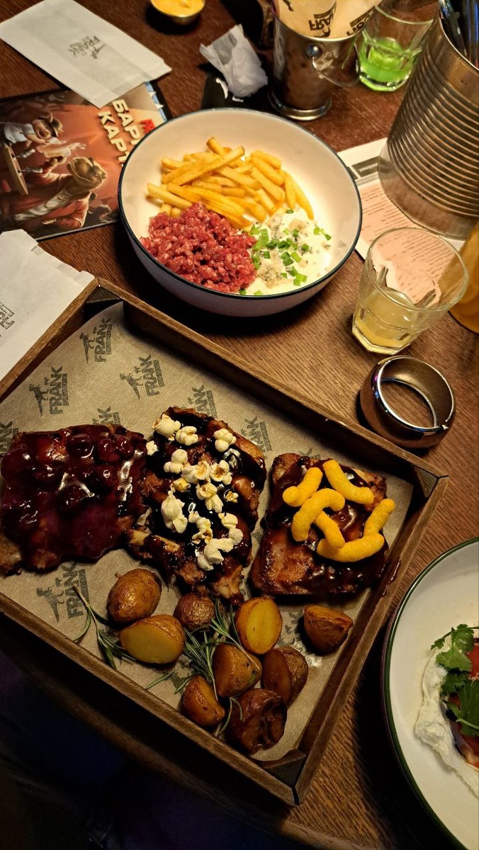 Всей душой и сердцем люблю Фрэнк. Самые вкусные ребра здесь. Но я как любитель тартара решила заказать: тартар с картошкой фри и соусом блючиз. Ещё один моментик - я люблю блючиз и заказываю его, если есть что то в меню. И получается все сошлось любимейший тартар с любимейшим соусом блючиз, я ожидала получить жоский кайф а получила....жоское разочарование. По отдельности норм. Соус оч вкусный,а тартар худший из того, что я пробовала, получается что то среднее. Какой из этого мы делаем вывод? Есть ребра и не рассчитывать на вкусные позиции вне. Такие дела. Что посоветуете во френке?