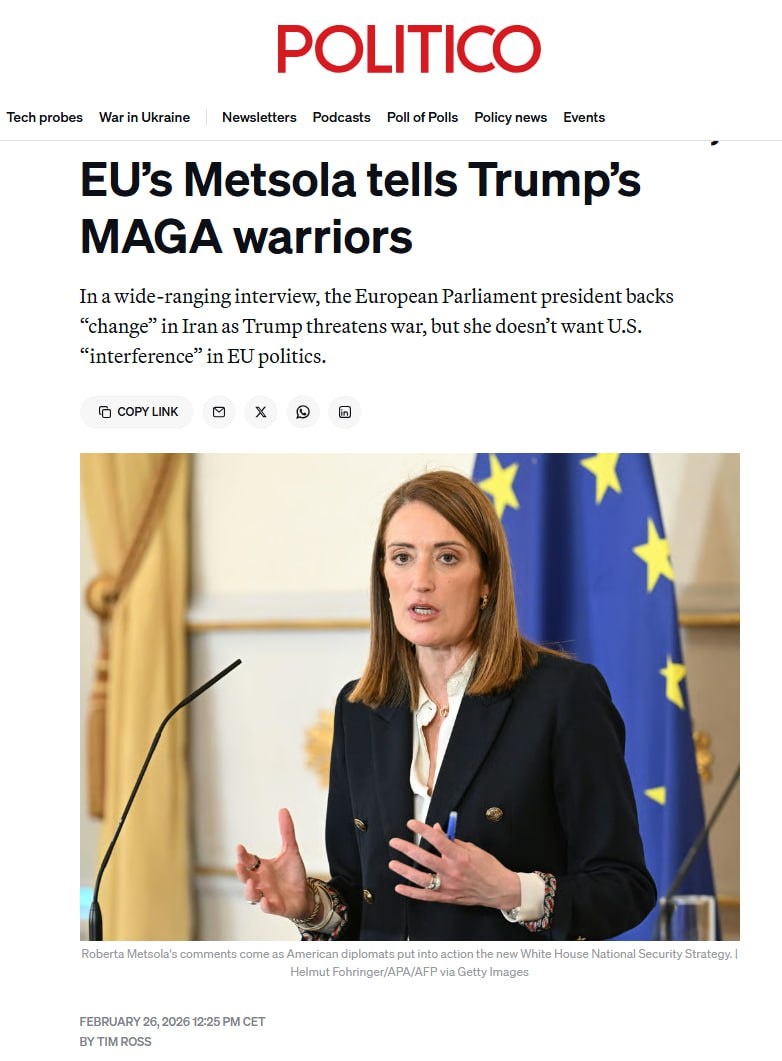 Председатель ЕП Роберта Мецола сообщила Politico, что она «не приветствует» влияние администрации Трампа на политику в Европе. «Мы часто говорим об этом с нашими американскими коллегами - так же как мы не говорим им, что делать в ноябре, мы как бы просим такого же к нам отношения». При этом чиновница не возражает против насильственной смены власти в Иране и готова «сделать что угодно» ради «свободных и честных выборов» в этой стране. А с чего она решила, что нынешний ЕС свободнее Ирана? 👍«БайБайден» в МАХ