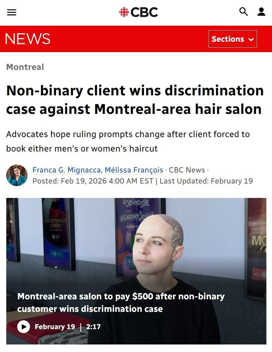 Тем временем парикмахерскую в Монреале обязали выплатить $500 небинарному🤮 клиенту за то, что в салоне ему предложили только мужские и