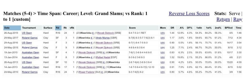 У него счет 5-4 в матчах против первых ракеток мира на турнирах Grand Slam, и 0-18 вне их.