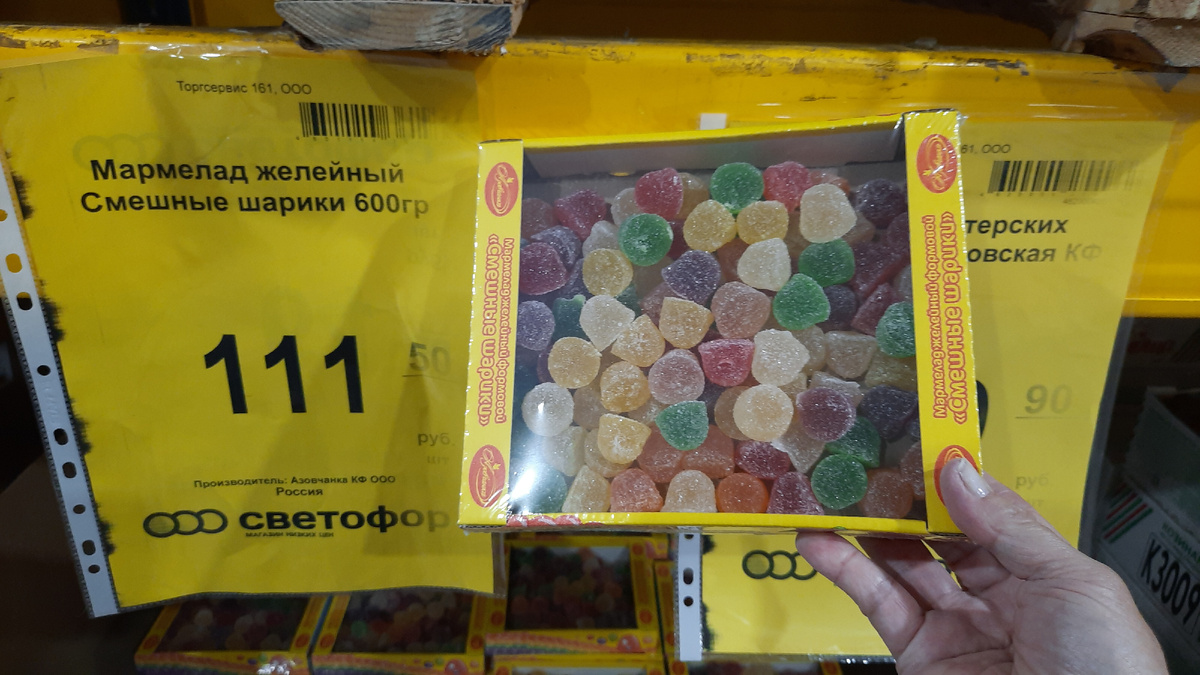 И начну обзор с кондитерских изделий. Мармелад желейный Смешные шарики 600 г цена 111.50 рублей. Иногда покупаю в Светофоре. Производитель Азовчанка КФ ООО Россия.