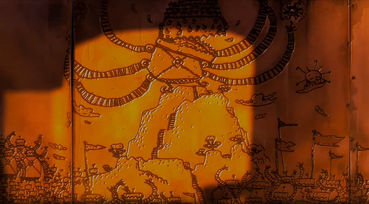 И даже здесь создатели мультфильма не поленились и постарались приблизить образ Солнца к тому как оно описано в легендах, так согласно легендам оно движется не само по себе, но его тянут вперёд его преданные лошади. В данном случае - малое солнце тянет за собою солнце Истинное. Которое уже остановить не получится даже такому сильному демону.