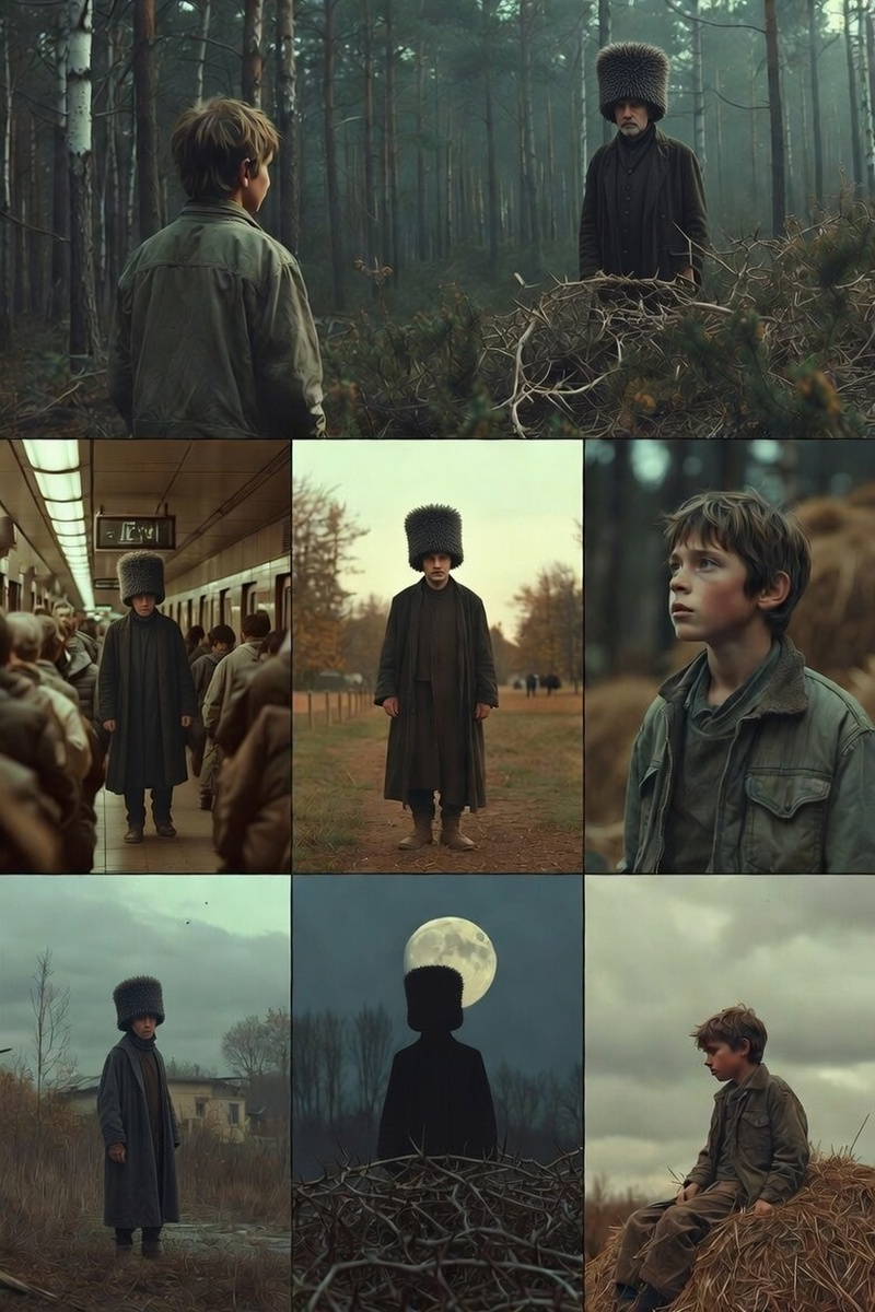 Лес, начинавшийся за полем, местные обходили стороной. Говорили, что те, кто заходил туда дальше чем на сотню шагов, исчезали без следа. Но я не боялся. Я просто пас скот, сидя на копне прошлогодней соломы, и смотрел, как солнце медленно тонет в дымке. И тут слева я заметил движение, резко повернул голову — и замер. На опушке стоял человек. Его облик был настолько чужд этому месту, что сердце сжалось. Коническая шапка-папаха, похожая на те, что носят на юге, длинное пальто, перехваченное тряпичным поясом… Он будто сошёл со страниц старой книги, а не вышел из советской деревни. Я видел многих странников, но этот… от него веяло холодом, будто он вышел глубоко из-под земли. Я встал и попятился от леса. Он медленно шел вдоль опушки, оглядываясь по стор