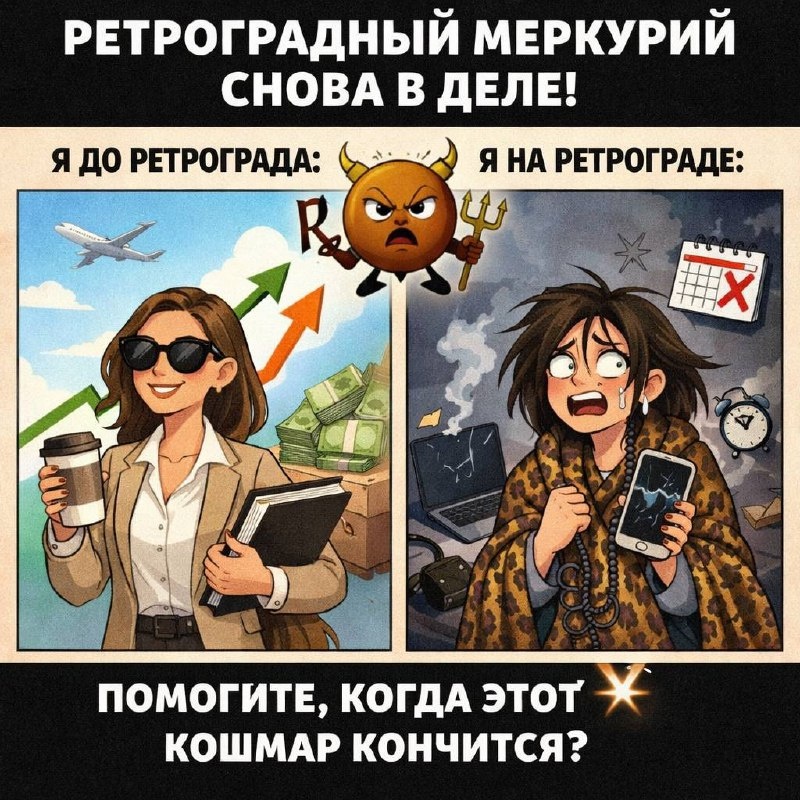 И снова по кругу: «ничего не подписывай», «не запускай», «пережди». Я так стараюсь не жить) Иногда слушаю все эти страшилки и думаю: мы правда собираемся поставить жизнь на паузу только потому, что Меркурий пошёл назад? Все!? Можно ложиться и ничего не делать?! Да, период особенный. Да фон меняется.Но это точно не стоп-кран….❌ У кого-то всё срывается. А у кого-то именно в ретро выстреливают проекты.! Почему? Потому что каждый ретроград разный. И потому что у каждого из нас своя карта. Если в натальной карте есть ретро-планеты, этот период может ощущаться вообще иначе.) Сейчас Меркурий в Рыбах и это больше про глубину, мысли, чувства, чем про запреты. ‼️Куда направить внимание: 1️⃣ Вернуться к старым идеям. Доделать, пересобрать, посмотреть иначе. Иногда успех лежит в том, что мы когда-то отложили. 2️⃣ Разобрать свои эмоции. Чувствительность сейчас выше всего, поэтому сейчас как никогда можно понять себя глубже. 3️⃣ Обратить внимание на людей из прошлого. Если кто-то появился (н