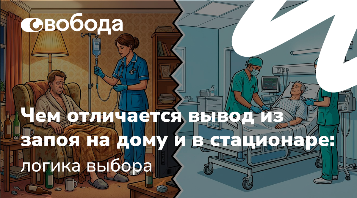 Старшая медсестра клиники «Свобода» в Москве Кудимова Марина Геннадьевна объясняет, в чём реальная разница между выводом из запоя на дому и выводом из запоя в стационаре, и какие вопросы стоит спокойно прояснить до начала помощи.