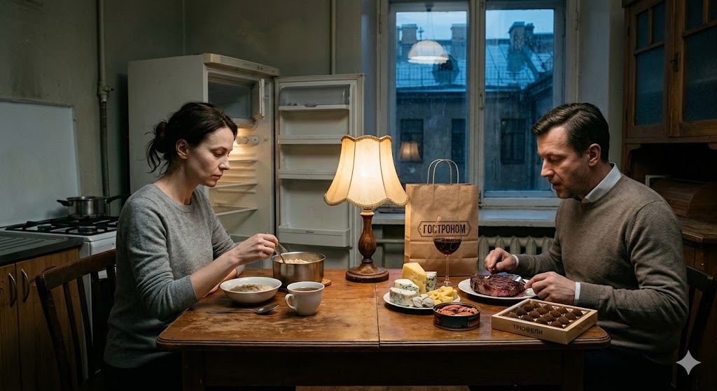Прошла неделя. Жизнь в их квартире превратилась в странный танец теней. Они жили как соседи в коммунальной квартире. В холодильнике появились «зоны влияния». На верхней полке — деликатесы Андрея, на нижней — скромные, но качественные продукты Елены.