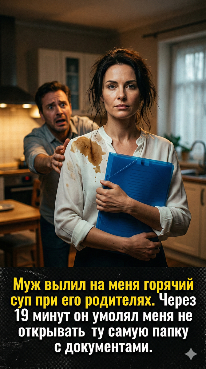 Я опустила глаза на стол. Жирное пятно от бульона начало покрываться тонкой белой плёнкой остывающего жира. Кусок варёной моркови лежал рядом с краем моей синей папки. За окном проехала машина, мазнув жёлтым светом фар по потолку нашей кухни. Я сделала один ровный, глубокий вдох. Воздух показался необычно чистым.