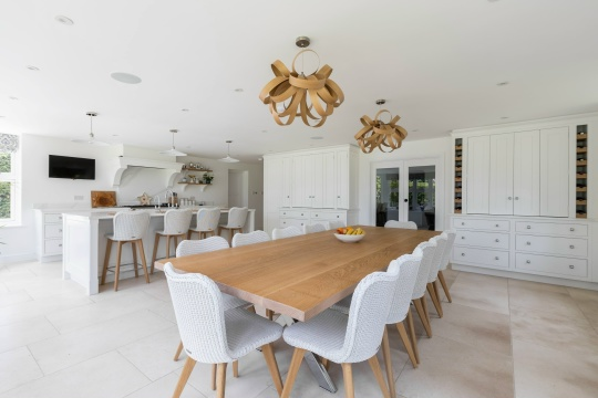 Большие кухни позволяют использовать более массивные столы и стулья. Обратите внимание на прочные материалы, такие как дерево или металл. Длинный стол может стать центральным элементом комнаты. Даже в большой кухне важно четко разделить зоны приготовления пищи и обеденную зону. Используйте ковры, подвесные светильники или разные уровни пола для визуального разделения. Свет играет ключевую роль в создании атмосферы. Над обеденным столом можно разместить стильную люстру или несколько подвесных светильников. Дополнительно можно добавить настенные бра или торшеры для мягкого освещения. Обеденная зона должна выделяться, но при этом гармонировать с общей цветовой гаммой кухни. Выберите яркие стулья или декоративные элементы, которые привлекут внимание и создадут уют. Украсьте стол красивой скатертью, свечами, вазами с цветами или фруктами. Это добавит тепла и уюта в обеденную зону. На стенах можно разместить картины или семейные фотографии, чтобы придать пространству индивидуальность. Убедит