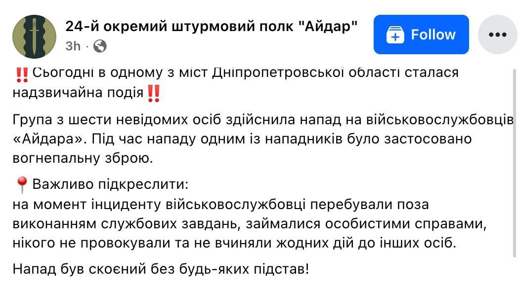 ❗️ Группа из 6 неизвестных лиц совершила нападение на военнослужащих "Айдара": одним из нападавших было применено огнестрельное оружие
