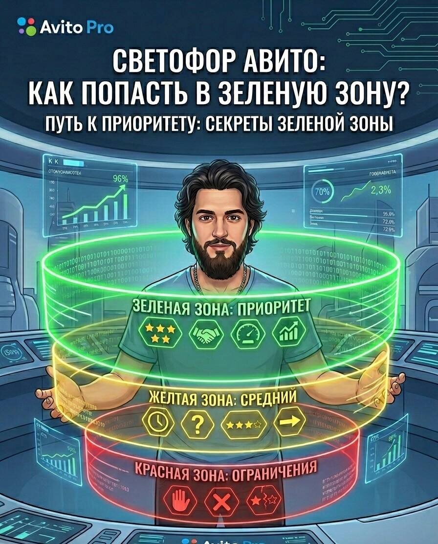 Авито давно перестал быть просто доской объявлений. Сейчас это умная нейросеть, которая непрерывно оценивает селлеров. В профессиональной среде эту систему оценки качества называют «светофором». От того, в какой цветовой зоне находится ваш профиль, напрямую зависят ваши показы, цена лида и итоговые продажи. Разбираем, как алгоритм делит продавцов: 🔴 Красная зона (показатель ниже 41%) Это фактически «теневой бан». Авито жестко пессимизирует ваши объявления. Вы можете вливать огромные бюджеты в платное продвижение, но охваты будут искусственно срезаться, потому что площадка считает ваш сервис плохим. 🟡 Желтая зона (средний уровень)