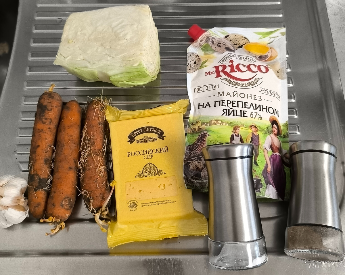 В большой миске соедините нашинкованную капусту, тёртую морковь, измельчённый чеснок и натёртый сыр.