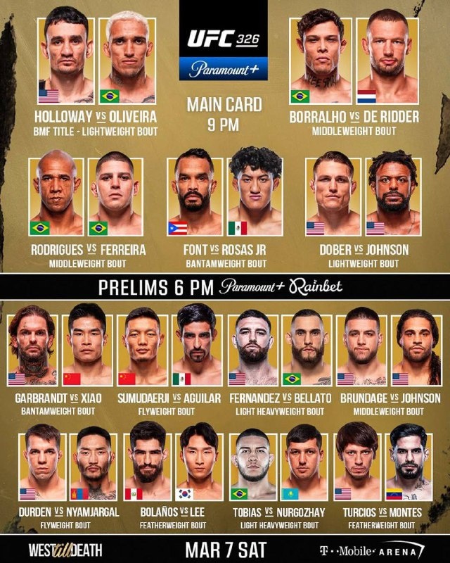 Актуальный полный кард турнира UFC 326, который состоится 7 марта! 🥊
