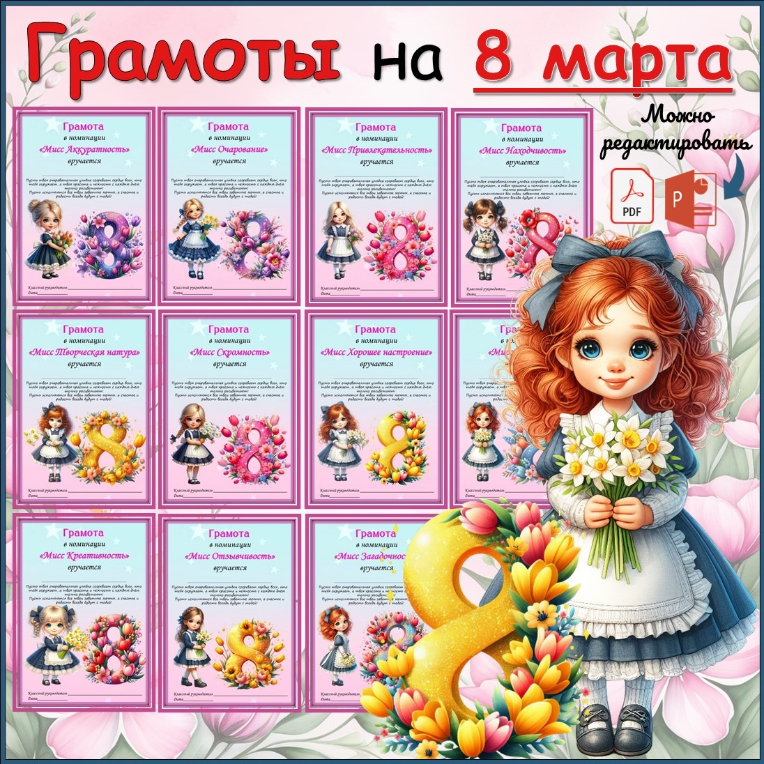 Ознакомиться подробно можно здесь по ссылке Грамота на 8 марта для девочек с номинациями. Готовые шаблоны, можно редактировать. 11 грамот : Пожелание : "Пусть твоя очаровательная улыбка согревает сердца всех, кто тебя окружает, а твоя красота и нежность с каждым днём только расцветают! Пусть исполняются все твои заветные мечты, а счастье и радость всегда будут с тобой!" Рекомендую распечатать на плотной бумаге. Формат А4 pdf Приглашаю Вас посмотреть другие мои работы :