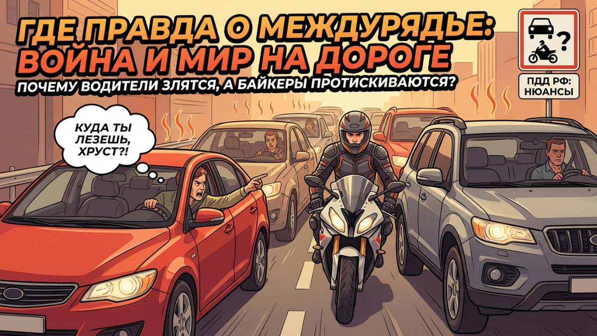 Каждый год с наступлением весны на дорогах начинается одна и та же игра на выживание. Мотоциклисты выезжают на улицы, и сотни тысяч водителей автомобилей одновременно делают глубокий вдох, полный ненависти. Стоит тебе сунуться в междурядье в глухой пробке, как обязательно найдется «учитель». Один принципиально прижмется к сплошной, чтобы закрыть тебе «калитку». Другой откроет дверь, чтобы якобы вытряхнуть пепел. Третий будет яростно сигналить в спину. Давайте без эмоций разберем эту вечную войну. Почему автомобилисты так бесятся, почему байкеры всё равно лезут между рядами, и на чьей стороне закон? Будем честны, 90% агрессии со стороны водителей авто — это не забота о безопасности. Это банальное чувство несправедливости. Представьте: человек едет с работы. Жара, кондиционер еле справляется, пробка намертво встала из-за мелкого ДТП в левом ряду. Он понимает, что будет торчать тут еще час. И вдруг мимо него, легонько рыча выхлопом, непринужденно прошивает поток мотоциклист. В голове води
