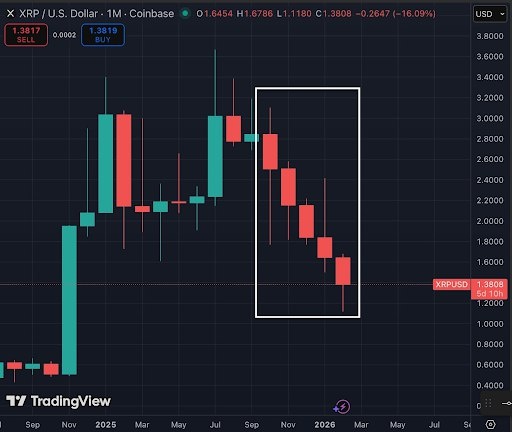XRP приближается к редкому техническому рубежу, завершая 5-й месяц подряд «красной свечой». Это может сигнализировать о переломе тренда, как это было в 2017 году перед сильным бычьим ралли. Текущая цена около $1.38, при открытии февраля в районе $1.64. 📊 Ключевые моменты: - XRP может закрыть февраль пятой подряд красной месячной свечой, что является редким событием для криптовалюты. - Подобные затяжные падения в прошлом (2014, 2017 годы) предшествовали значительным разворотам и сильным бычьим фазам. - Текущий диапазон поддержки находится в районе $1.20. - Аналитики ожидают "зеленого" марта, но без "God candle" — восстановление, вероятно, будет более плавным. - Важные уровни сопротивления: $1.60, $2.00, $2.50, а затем $2.80 и $3.00.
